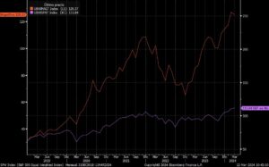 Sin lugar a dudas, el comportamiento de estos valores desde 2018 hasta hoy ha sido tremendo. Es la gráfica del S&P sin los 7 magníficos y los 7 magníficos que estos últimos han más que doblado la resto (gráfica de realización propia con Bloomberg).